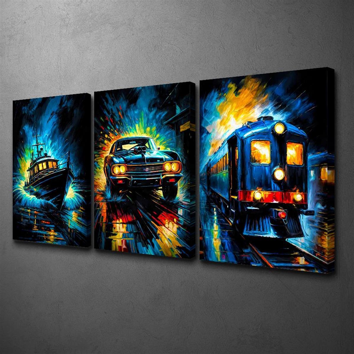 Okay, listen up bestie! You know how your room is, like, totally basic? It needs a serious glow-up, and this wall decoration art is the lewk you've been searching for. This ain't your grandma's transport art – we're talking a set of three canvas art prints that'll transform your space from "meh" to "OMG." Think retro vibes with a transportation theme – ships, cars, and trains – all splashed with that fire retro city night neon oil painting aesthetic. It's giving sophisticated, it's giving edgy, it's giving you. These prints are like a curated mood board for your wall, perfect for adding that crucial personal touch that screams "I have taste." This [wall decoration art] set is all about injecting some serious personality into your living space.