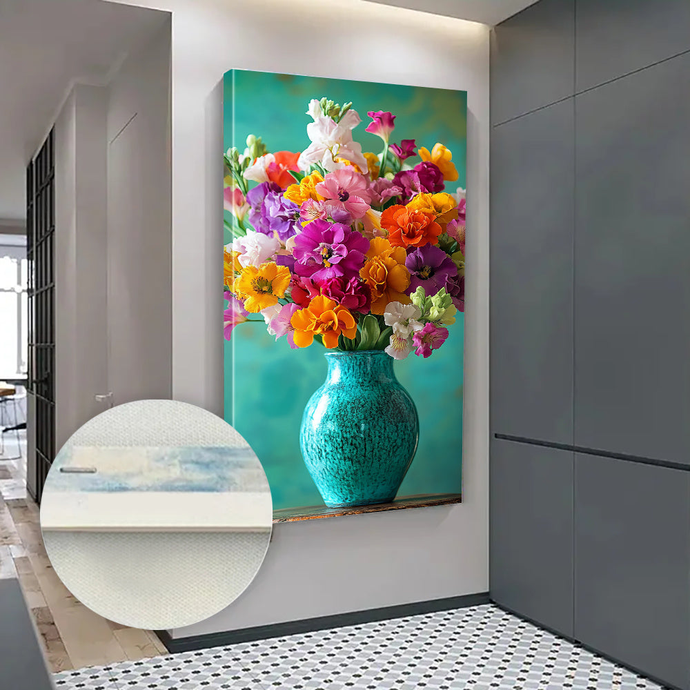 Okay, so check out this wall art. It's not your grandma's floral arrangement, that's for sure. This framed floral and botanical canvas art is straight fire. Imagine a vibrant, colorful bouquet practically popping off the canvas, chillin' in a cool turquoise vase. The colors are, like, everything. We're talking major aesthetic vibes that'll instantly upgrade any space from "meh" to "OMG, where'd you get that?!" It's giving serious modern art deco, but with a playful twist that makes it totally Gen Z-approved. Forget those boring beige walls; this piece is a whole mood.