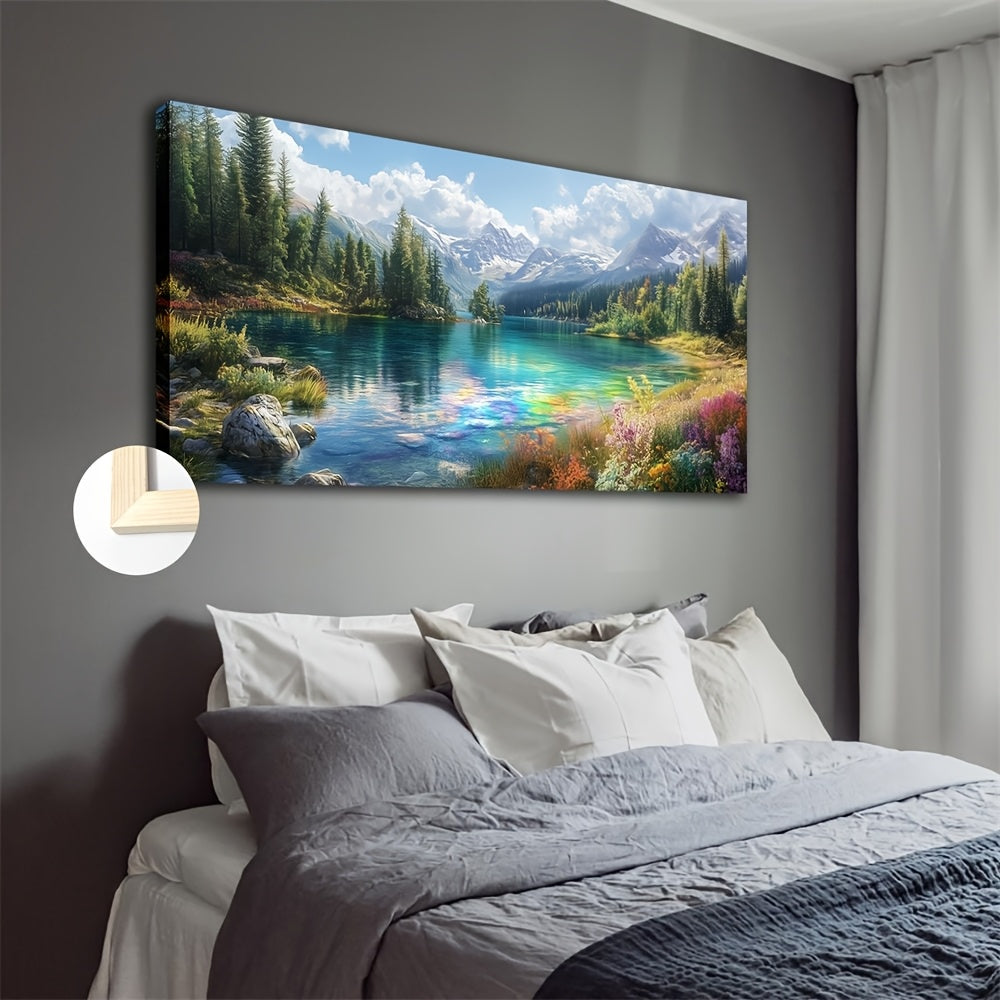 This canvas wall hanging art decor isn't just visually stunning; it's built to last. The durable wood and cedar frame ensures your artwork stays looking fresh AF for years to come. Plus, the transverse orientation and solid pattern make it super versatile, fitting seamlessly into any aesthetic, whether you're going for a full-on wall Art Deco vibe or something more understated. Seriously, this piece is a vibe. Imagine waking up every day and seeing that calm lake reflecting those majestic alpine woods – talk about setting the tone for a productive, stress-free day.