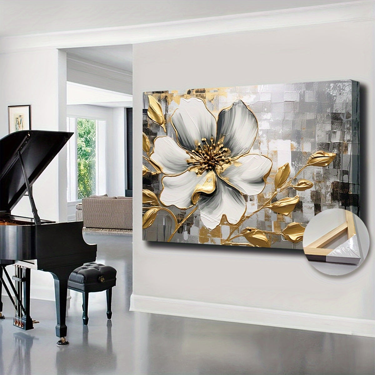 This isn't your grandma's floral arrangement, okay? The abstract style brings a totally modern twist, making it the perfect statement piece for any room. And because it's already framed with quality fir wood and ready to hang, you can skip the extra hassle and get straight to flexing your decorating skills. Whether you're decking out your kitchen, bedroom, or living room, this canvas wall art will instantly elevate the entire space. I'm telling you, this canvas art print is the missing piece. This floral and botanical art piece is not your average, basic wall art decor. It's a whole mood, and you need it in your life, period. The golden elements are pure artistry.
